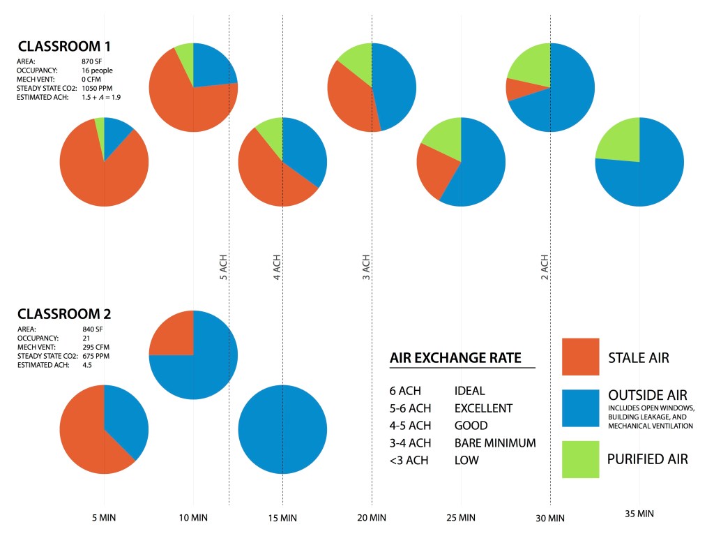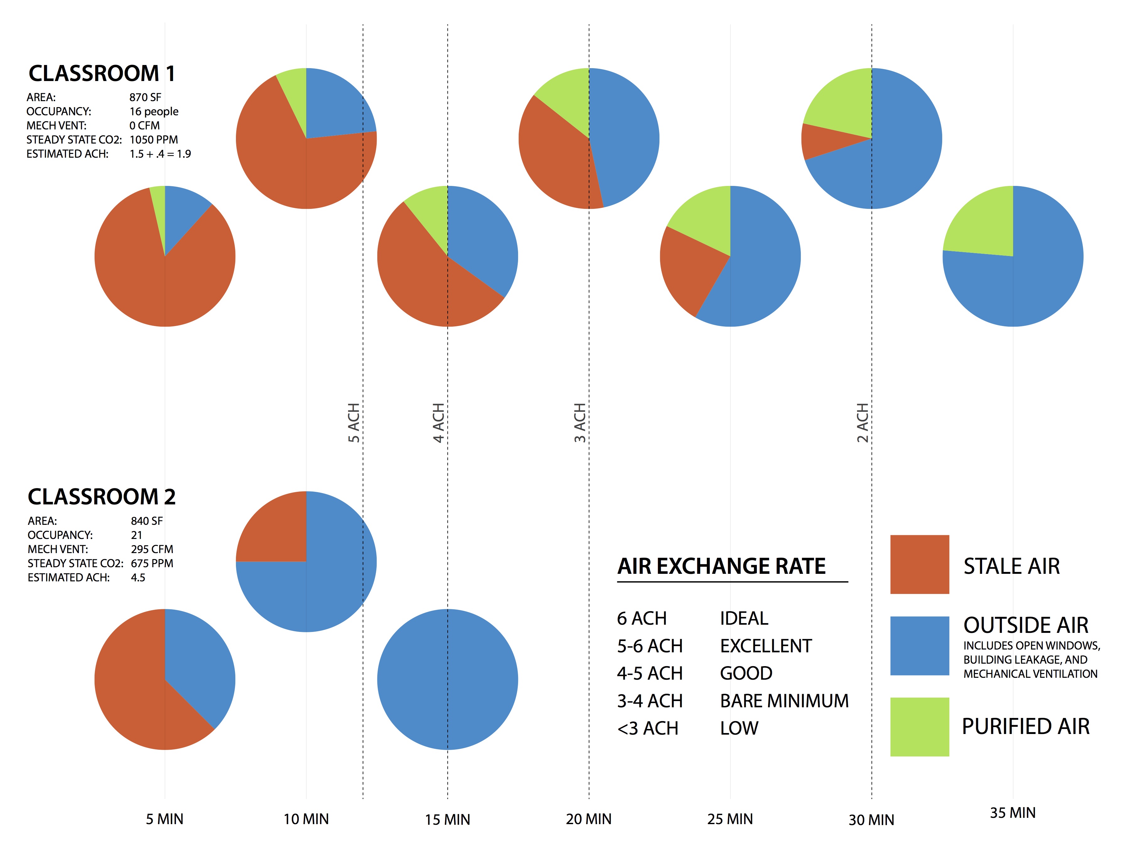 In current temperatures, teachers can leave the classroom windows open for fresh air, but based on measurements that my third-grade son has taken of the carbon dioxide concentration in his classroom, we’ve determined that the outdoor air supply through open windows and building leakage provides only 1.5 air changes per hour in the room. The air purifier is providing an additional .4 air changes per hour, but that’s still less than 2 air changes per hour total, meaning that exhaled viral particles can linger for over 30 minutes.
