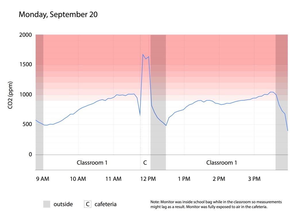 The cafeteria has a mechanical air supply of 490 cubic feet per minute, but with 50 students in it, that’s not enough. This graph shows the CO2 concentration in the cafeteria — a measure of how much air has been in someone’s lungs — spiking over the lunch period. This is deeply concerning in a space where students are removing their masks to eat lunch. At Penn Alexander and Greenfield, students are eating lunch outside to mitigate this risk, but my son’s school doesn’t have the resources or staffing to do the same.